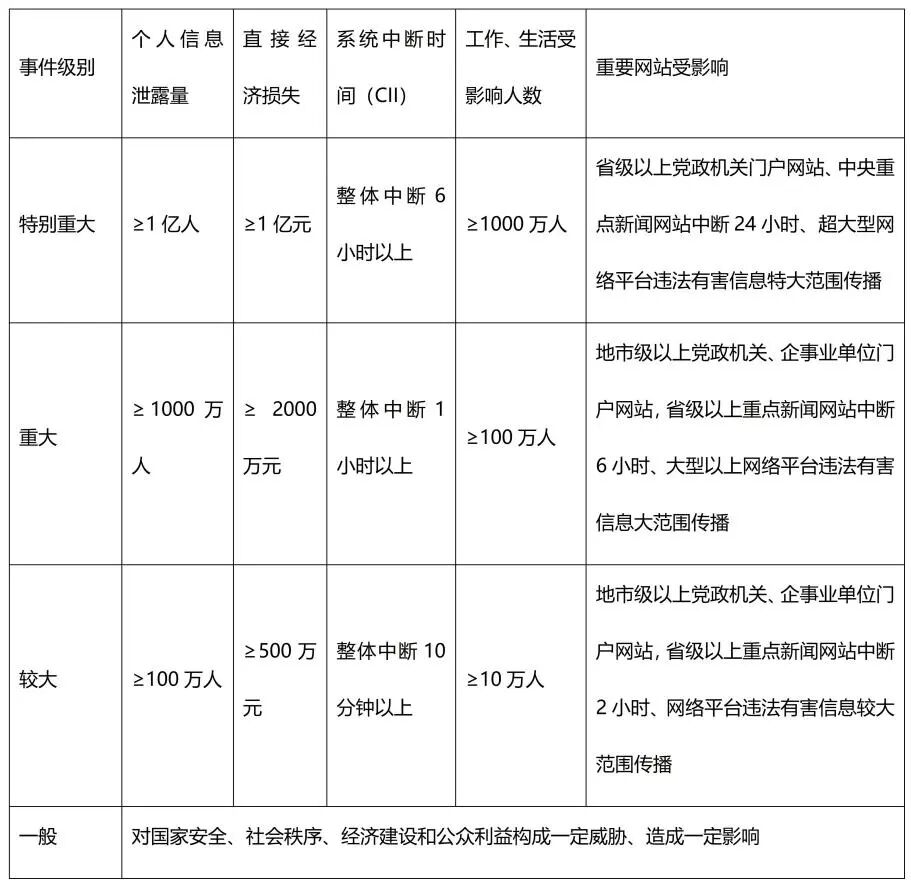 网络安全事件是指由于人为原因、网络遭受攻击、网络存在漏洞隐患、软硬件缺陷或故障、不可抗力等因素,对网络和信息系统或其中的数据和业务应用造成危害,对国家、社会、经济造成负面影响的事件。根据影响程度,分为特别重大网络安全事件、重大网络安全事件、较大网络安全事件、一般网络安全事件,部分判断标准如下表。